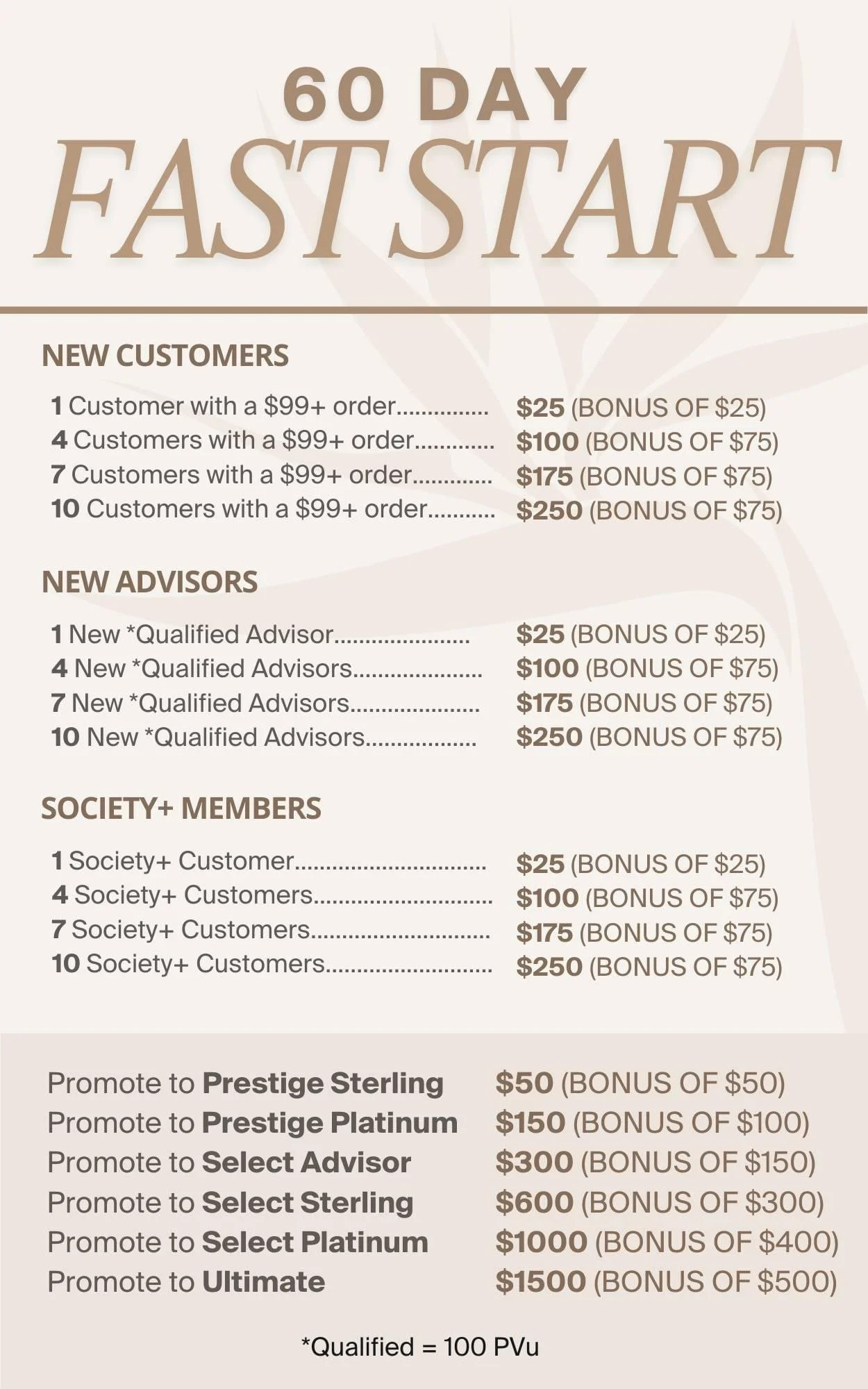 25% base commissions and 5% bonuses starting at $500 in sales. Beauty advisors receive 25% off all products and free shipping on orders over $50, plus 50% off the product of the month.